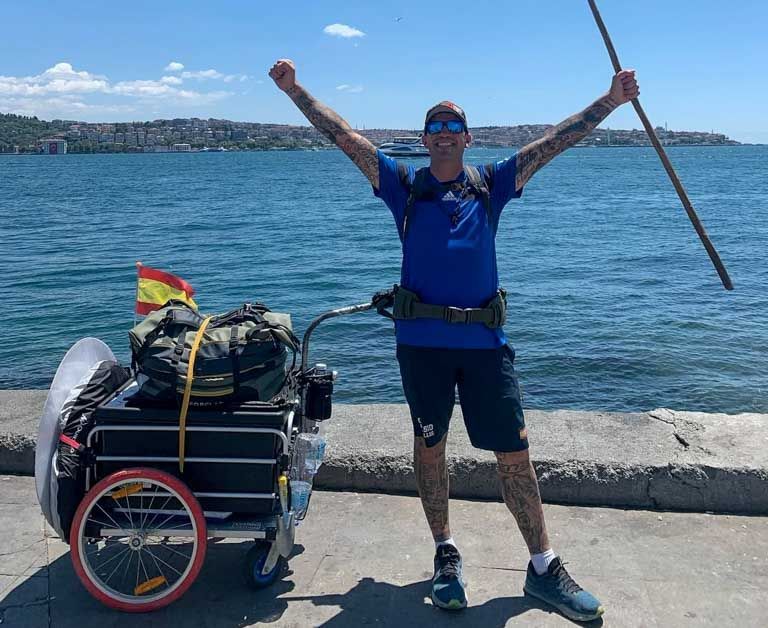 Animado por aquel viaje, en enero de 2022, Santiago inició otro gran viaje, pero esta vez a pie desde España con el objetivo de llegar al Mundial de Fútbol de 2022 en Qatar. Durante su travesía, recorrió más de 6.500 kilómetros, sus pertenencias en un carrito con las cosas más necesarias. Su ruta lo llevó a través del sur de Europa (Francia, Mónaco, Italia, San Marino, Albania, Grecia) hasta Turquía, donde interactuó con las comunidades locales, especialmente con los niños, documentando su viaje en su cuenta de Instagram. Y recogiendo basura a la vez que llevando a cabo campañas de sensibilización con jóvenes del país.